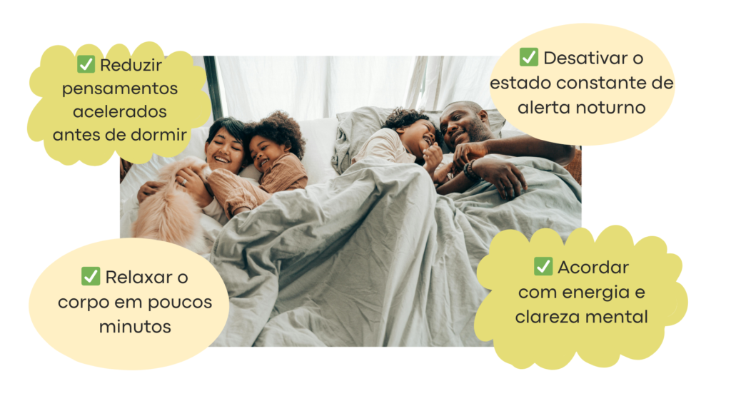 Adormecendo em poucos minutos, sem pensamentos acelerados, sem medo do amanhã e sem depender de remédios para conseguir relaxar.